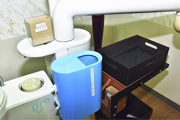 当院では写真の高圧アルコール蒸気滅菌機により、器具の消毒を行い、肝炎やエイズウイルスの感染予防を徹底し、また、皆さまが履かれるスリッパも自動滅菌機によりその都度消毒しております。